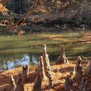 池のそばのラクウショウ 色んな形の気根がポコポコ出ていました。 足元をしっかり見て歩かないと、落ち葉に隠れた小さな気根に何度もつまずいてこけそうになりました。 ー神戸市森林植物公園ー