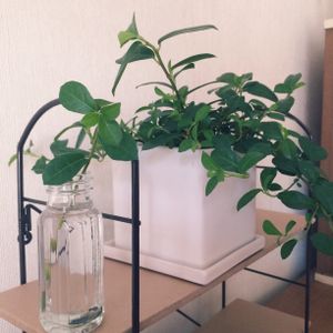 やっぱりアイビーの入ってた空き瓶が寂しくて… フィカスシャングリラの長すぎた部分を切って水差し✨ 発根するかどうかはわからないけど… やってみよう(´・ω・)