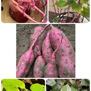 🍠サツマイモ🍠 さ昨年の秋,半分使い忘れたサツマイモから出た芽を観賞用に育てていましたが、今年の5月に庭の菜園に植え付けてみました サツマイモを育てるのは長い家庭菜園歴でも初めて 待ちきれず9月に一株掘り起こしたら長茄子ぐらいの細さ 早すぎたー😅 今日は✌️大きく育っていました╰(*´︶`*)╯♡ ふかし芋、天ぷら、サツマイモの炊き込みご飯、、、 美味しく頂きましょ😋 残念ながらお花は見られませんでした😔