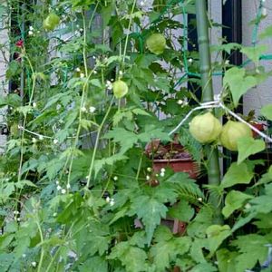 ベランダのシンク横にある排水管に 網を巻きつけて、 そこにツルハナナスを絡めています(^_−)−☆ そうすると。。。 つる性の植物を楽しめるだけでなく 見せなくない排水管も隠せて 一石二鳥なのでした♬