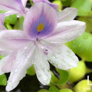 この時期、庭にいくつか設けた小さな水辺でホテイアオイの花が咲いています。