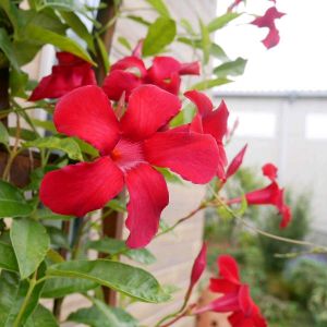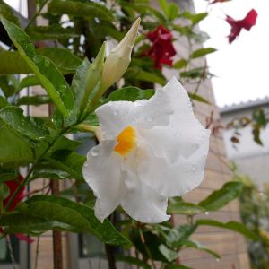 クライミングサンパラソルの白い花が 秋になってから咲き始めました。 真夏に赤い花と白い花が混じり合って咲くのを期待していたのに、、、 サイトだと冬越しには5℃くらいが必要なようで、 屋外だと無理かも。