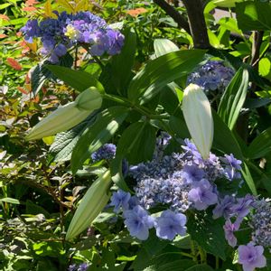 カサブランカと紫陽花 ♪小さい花や大きな花 どれもみんなきれいだね