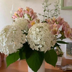 長男の結婚1周年の記念日に、 急な思いつきで、お花を切ってみたけれど 飾る入れ物もないし・・ と笑って断られて 置いてきぼりに。 花器つきで持たせればよかったかな 仕方ない。 この暑さだし、虫がついているかもしれないし 我が家の玄関で 涼んでもらいましょう