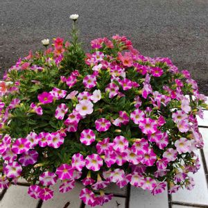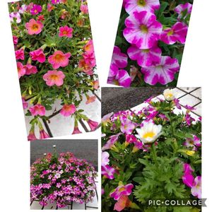 カリブラコア 品種不明 白八重 カリー ストロベリー 白八重は冬越しし続け4年目、カリーは昨年購入、挿し芽が冬越ししたもの。冬越しすると色や模様が変わる品種もあるけど、この2つは変わらないです😃 左奥のピンクは別のペチュニアです