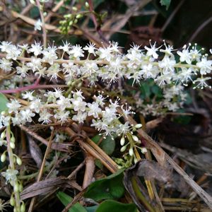 野菜の花❹-3 ものすごい勢いで繁茂しています❗️ オカワカメ(陸わかめ) *ツルムラサキ科アカザカズラ属 花期は9月〜10月 熱帯アメリカ.熱帯アジア原産のつる性多年草! 茎.葉.ムカゴ.球根まで食べることができ栄養価も高い! つるは3m以上伸び グリーンカーテンとしても利用されている! 花は雄蕊ダンシング状態で驚きました‼️ ①花色はクリームがかった白! ②カオス状態です! ③この葉が美味しいらしい! 9月24日撮影 宮城県青葉区