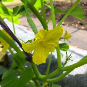 今日も最高気温が体温越えになりそうです🥵💦 愛犬の大好きなキュウリ🥒の苗を先日買いました。 黄色の可愛い😍お花が咲きましたよ。 いつ食べれるかなー?!