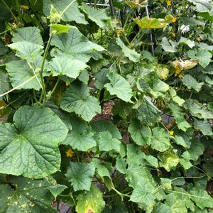 今週のキュウリ翡翠 ボロボロなので処分したいが家族に反対され断念 耐病性低いから来年は作らないと言ったら、来年は翡翠だけで良いとか言い出した、、、。 2週間毎に予防しても2ヶ月しか持たないのにさ😵