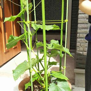 気になっていた ベランダのキュウリをお引越しさせました。 その間玄関前で風に煽られ倒れていました。 (_ ..)_ バタリ ツルは切れ、土がこぼれ、葉っぱがグッタリしていました。 畑に行っても、土が軽くて、グラついたので、 応急処置として、穴を掘り、 プランターごと埋め込みました。 高さも足りてない💦💦 後で伸ばしてもらおう⤴︎ ⤴︎⤴︎ 大丈夫かな(>︿<。)