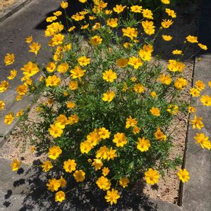 仕事先の花壇 こぼれ種からキバナコスモス これでも1株。この酷暑の中、水もろくにやらないのに…強い!