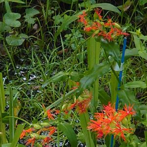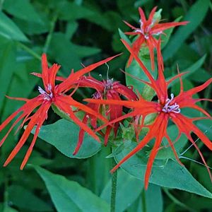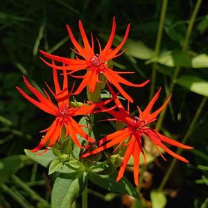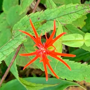 *エンビセンノウ* ナデシコ科 北海道と本州中部地方に分布、山地の湿地帯に稀に生える多年草。 お花は赤に近い朱色、花びらは5枚で細く深い切れ込み、さらに小さな切れ込みがあり、珍しい形をしています…❣️ 絶滅危惧1B(EN)に指定されているそうです。 入笠すずらん山野草公園・1740m