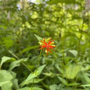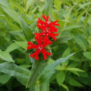 エンビセンノウ(燕尾仙翁) 初めましての花です☺️ 緑の中に不自然なほど赤い色を放ってアピールしてました✋ 花弁は細いのに存在感が際立っています😳