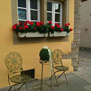 ドイツ ローテンブルク旅行時の写真になります。 旧市街のおとぎ話の中にいるような可愛らしい街並み。 窓辺のお花に、グリーンの丸いアレンジメント、お洒落でした。