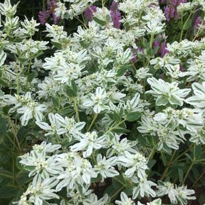 スイスのアイガーグレッチャーからクライネシャイデックへハイキングした時の一枚です。高山植物たちの後方にそびえ立っているのは、少し雲がかかっていますが、右からユングフラウ、メンヒ、アイガーの山々です。