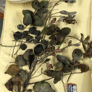 イスノキ巡りで拾ってきたムシコブの数々,単三電池は大きさの参考です。 ぱっと見ただけで,6種類はあると思われます。それぞれの虫がそれぞれに特徴のあるムシコブを作るそうで,イスノキは,コブの付きやすい変わった木,と言えます。コブが有るからと言って,樹勢が衰えると言うことはない,と書かれていました。なんとも不思議なものです。