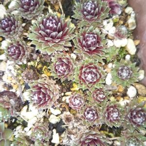 右上↗センペルビウム・スノーブルギーさん😻💗🤍 左側下↙センペルビウム・エウレカさん😻❤️🤍💛 左上と左下の一つづつのもけもけは センペルビウム・アビーさんです😻❤️🤍 赤〜赤紫のグラデーションの鉢を作ろうとしたのですが…ナンカチガウ…😸💦