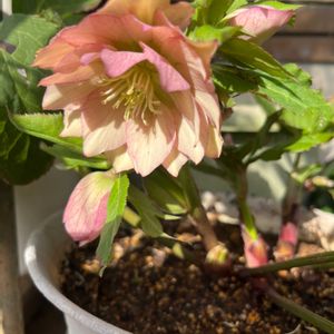クリスマスローズ エレガンスフレアーピンク 大輪のこの子はとっても綺麗で、複雑に重なり合う花弁が魅力的😍 でも俯いて咲くと云う寄り、下向きに下がって咲くが合ってるかな🤭 昨日夕方の様子❄️❄️折角咲き始めたのに…💦