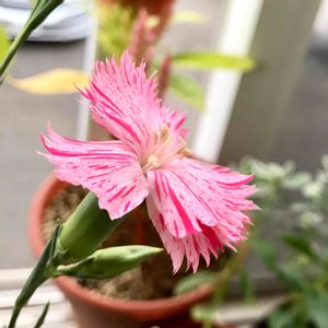 4月に植えたカーネーションがやっと咲きました!✨😊 しかも一重咲き! 珍しいものじゃないかもしれないですが、私は八重咲きばっかり見てきたのでとっても新鮮です💐 この花の色のカーネーションは初めて見ました😌🍀