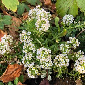 今日のお花🌸アリッサム🤍 こぼれ種っ子🥰 落ち葉のお布団かけてまぁす😊🎶