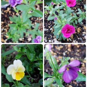 花壇のちっちゃいもの倶楽部😍 上 冬越しして花壇に植えておいたら何とか梅雨を生き延びたカリブラコアさんたち。 下 こぼれ種っ子ビオラさんたち。暑いけど頑張れ〰️❗😆