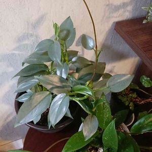 おはようございます😊 今日もいいお天気です🌞 ホヤの斑入り葉っぱと伸びた蔓が好き このコは置き鉢に植えました🌱 フィロデンドロンのメタリックな シルバーグリーンの葉っぱが どんどん新葉が生まれています😆 元気に育ちますように𓂃٭☺︎
