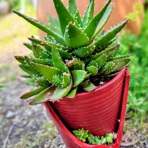 アロエ不夜城💚 子株がモリモリ育ってきた🌱🌱🌱 嬉しいな(*´艸`)♬♡ 素焼き鉢の白檀🌵 開花❤️❤️ 勝手に同居中の紅稚児 ( *^艸^)カワイイ♡.*・゚