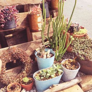 廃材中心に構成した多肉コーナー。 冬の間に作ったセダムリースはカラカラでドライフラワーになってしまいました😥ごめんね、セダムン💦