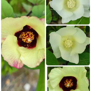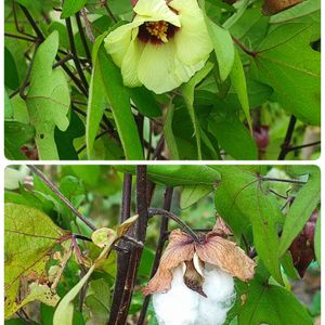 コットンフラワーからワタができるまで 左上(昨日)白い花 ↓ 右上(今日)しぼんでピンクに ↓ 左下(将来)実 ↓ 右下(更に将来)実が弾けた ↓ 収穫 ↓ で、どうする? こんな感じです🤭