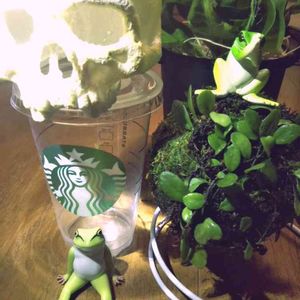 🐜の巣玉が着いてた苔玉をリユースして頂いた豆ヅタをくっつけてみました👍️ 💀のとおるちゃんまた登場♪稲川じゅんじさんもそろそろ出稼ぎの季節ですしね😆