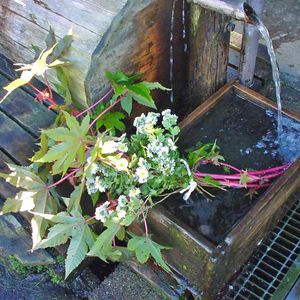 旅行記その7。 中山道を歩いて旅した際、須原宿の水場で見かけた花束です。 中山道はこういう公共の水場が今でも結構残っていて、どこもきちんと管理されていますね。 そういう光景を見ると日本の良さを感じます。 ピンクの茎のは、赤オクラか何かだったんでしょうか。 2000/11/4 撮影