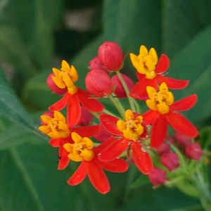 アスクレピアス 長い絹状の毛を持つ種の姿からトウワタ(唐綿)の和名を持つ まだまだこれから、咲く気満々❤️🧡💛どこまでが花?まん丸蕾も可愛🔴