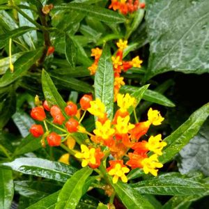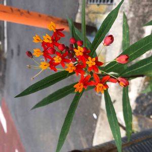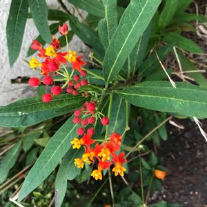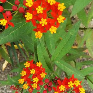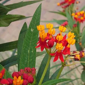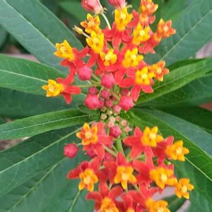 8/9㈰③ アスクレピアス・クラサヴィカ・レッドバタフライ 今年も出会えました〜😃❣️❣️ ツートンカラー可愛らしいです🤗❤️💛 葉を見るとキョウチクトウ科だから夾竹桃の葉に似て細長いですね〜😄🌿