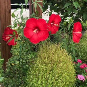 🌺🌺フレアちゃん&赤の車🚘🚗 タイタンビカスフレアが庭先で頑張ってま〜す🎶