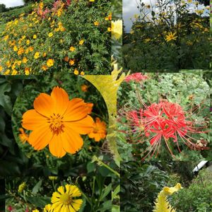 今日のお花 ススキ(芒) ②〜④ダンゴギク(団子菊) ヘレニウム 北米産のきく科の多年草。中央の筒状花が盛り上がってダンゴのように見えるところからつけられたようです。中段の花壇から倒れて、咲いています。写真を撮るには丁度良かった🤭 🏷日曜日はビタミンカラーの日 参加させて下さい。