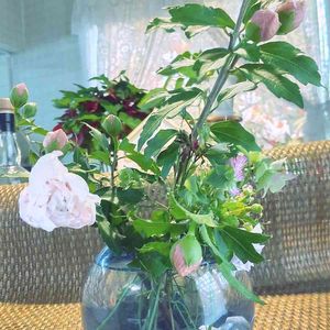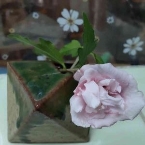 剪定したムクゲ、切り戻ししたペチュニアとニチニチ草をガラス鉢とミニ花器に💐