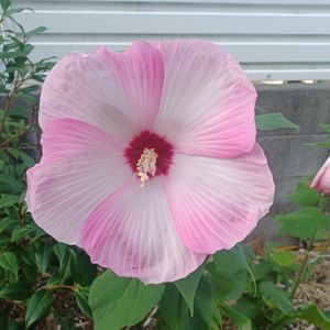 我が家のタイタンビカスが咲き、奥を覗いたら 扇風機の羽の風の通り道が、可愛く空いてます アメリカフヨウとモミジアオイをかけ合わせて 赤塚植物園が開発した、強健で大きな美しい花