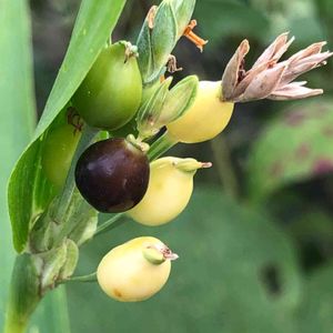 ジュズダマ(数珠玉) 別名 トウムギ(唐麦) まっすぐに伸びた茎の先に変わった花💕実のように見えるのは苞鞘(ほうしょう) と呼ばれ、この中に雌花がある。 苞鞘から穂のように出ているのが雄花。 ジュズダマの苞鞘は固くなり、艶も出てきて数珠やネックレス、お手玉の中の身に使われる。  よく似た栽培種のハトムギは穂が垂れている。また苞鞘が柔らかく細長い。 ハトムギ茶や化粧水などに使われている。 水辺、荒地などに自生。 2023.10.20撮影