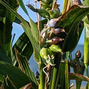ジュズダマ🌿 (数珠玉) 別名 トウムギ 突然トウモロコシに似た葉が出てきたので、何だろうと見守っていた所数珠玉でした☺️ こちらでは見かけた事がない植物で、皆さんの投稿で知った子です。 今年お迎えした沢桔梗に付いてきた様ですが、最近実の色が緑色から黒く変化して来ました🖤