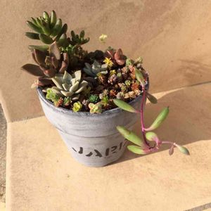 シンプルなリメ鉢に虹の玉を含むミックス苗を買ったものをメインにしてセダムをあちこち散りばめた寄せ植えを作ってみました! ルビネちゃんはタレ係さん! うまく根付いたら嫁に出します😁 虹の玉はもう赤くはならないかなぁ。