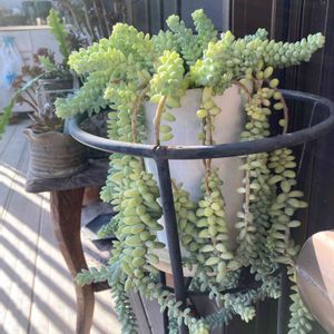 新玉つづり、いろんな置き方しましたがこのアイアンがポロポロ葉が落ちないいい塩梅の居場所なんです。 風の強い日だけ室内に取込みます。
