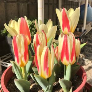 チューリップ🌷 原種系ミニチューリップ ザ・ファースト 4年目球根 掘り上げもせず 植えっぱなしで 今年も元気に咲いてくれた😊 去年より 1週間遅い開花 いっぺんに咲きだして 雨風に弱り茎が倒れ💦💦 見頃は短かった😢 来年も会える。。よね❣️