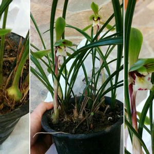 突然託され右往左往。 この子シュンランでしょうか? 左の写真のようにバルブがツートンになっていて心配です。 そしてさ迷う根っこを見るに要植え替え?? プラ鉢から素焼きだと体調を崩しちゃう? ランとか明らかに難易度の高そうな…!