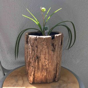 【春蘭】 直径20センチほどの木をくり抜いた鉢です。表面がデコボコなので、何かを着生させようかと思案中です🤔 道の駅から鉢付き850円でお迎えしました。