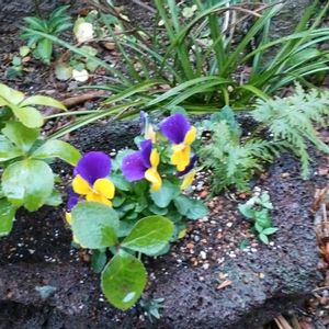 おはようございます。 ミニの寄せ植えです。上には春蘭早春に咲きます。右下の枯葉はアヤメ春に咲きます。どちらにも相うものを家にあるものにビオラを加えて軽石の鉢植えにして見ました。