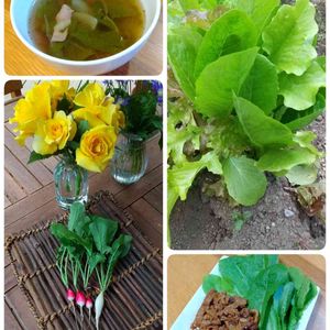 今日の晩御飯🌃🍴 畑に撒いたレタスが育ったので(右上↗️)味付けして焼いた豚肉と一緒に(右下↘️) プランターのラディッシュの間引き菜(左下↙️)は、ベーコンと玉ねぎと一緒にスープに(左上↖️)🎵 自分の畑で収穫したものは、それだけでご馳走ですね(o^-')b !💗