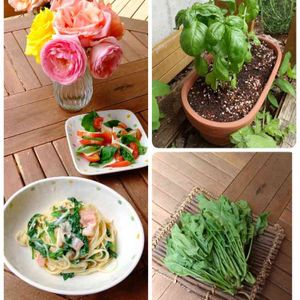今日の昼食です😄 旦那さんが畑に種を蒔いて育てたホウレン草🌱は、蒔く時期が遅すぎて小さいままトウが立ちそうだったので、収穫してクリームパスタに🍝 そして、バジルが育ってきてるので、フレッシュバジルを使ったカプレーゼ🍅🌱 どちらも大好物ですし、ホウレン草は柔らかく、バジルの香りもしっかりして美味しかったです😋🍴💕