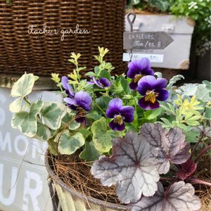 こんばんは🌙 渋カラーのビオラとリーフ4種の寄せ植えです💜💚💛 今日も一日お疲れ様でした😊