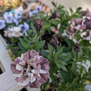 今朝は霜が降りてた❄️ ペチュニア ジュリエット 茶色っぽかったり紫っぽかったり 楽しいお花🎶 庭の終わった鉢を片付けなきゃだけど、こぼれ種のビオラも頑張ってます✨