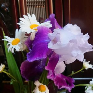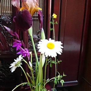 【今日の献花】ご近所さんからいただいて実家におすそわけしたジャーマンアイリス。 白と紫の気品ある姿、かすかに香りもするんですね、、、 フランスキクと一緒にお供え、、、 草むしりで誤って摘んでしまったヤグルマキクは窓辺に、、、