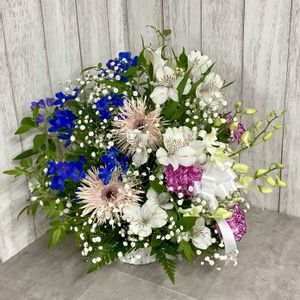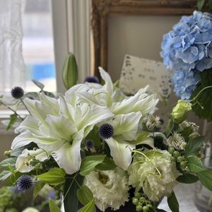 音楽メンバーの先輩👩🦰のお母様の49日に…🙏 👩🦰オーナーシェフでもあるのですが、グランドピアノが置いてある趣のあるお店で…7月にはお母様の追悼を兼ねてご両親から引き継がれたお店でプチ🎹コンサートとご本人はアリアを披露されるそう…🎶 今回もアレンジの先生に依頼しましたが、昨年の5月のlessonで丁度同じ花材を使っていました。 花粉の無い上品な百合アイシャに瑠璃玉アザミ、リキュウソウ…と本当に素敵な組み合わせです(*´∀`*)